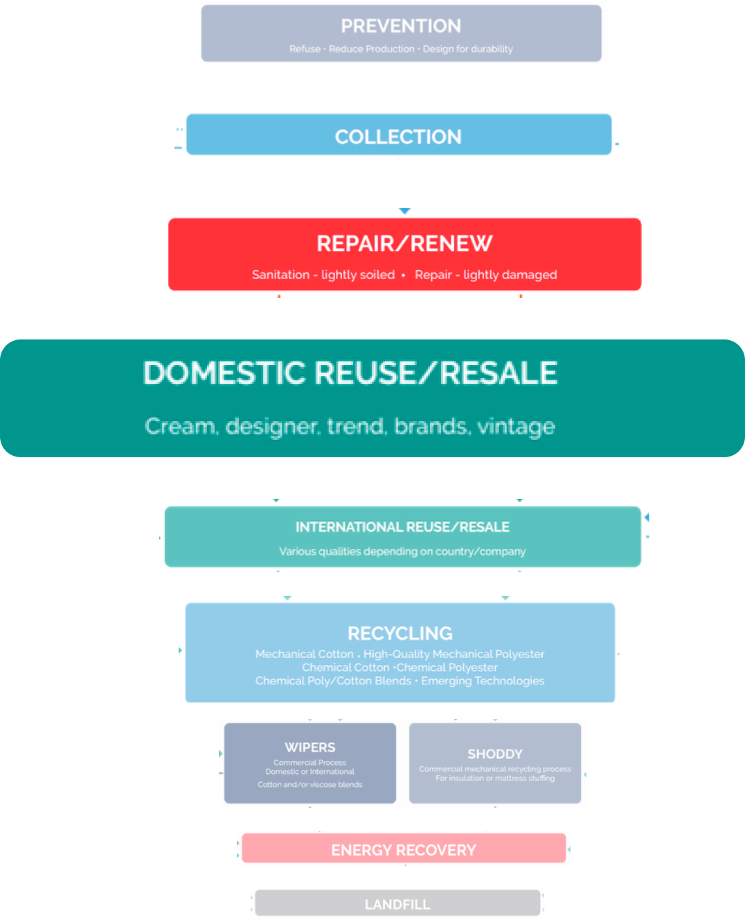 The Next Use Network follows the Spent Textile Hierarchy, which ranks textile management strategies from most to least preferred: